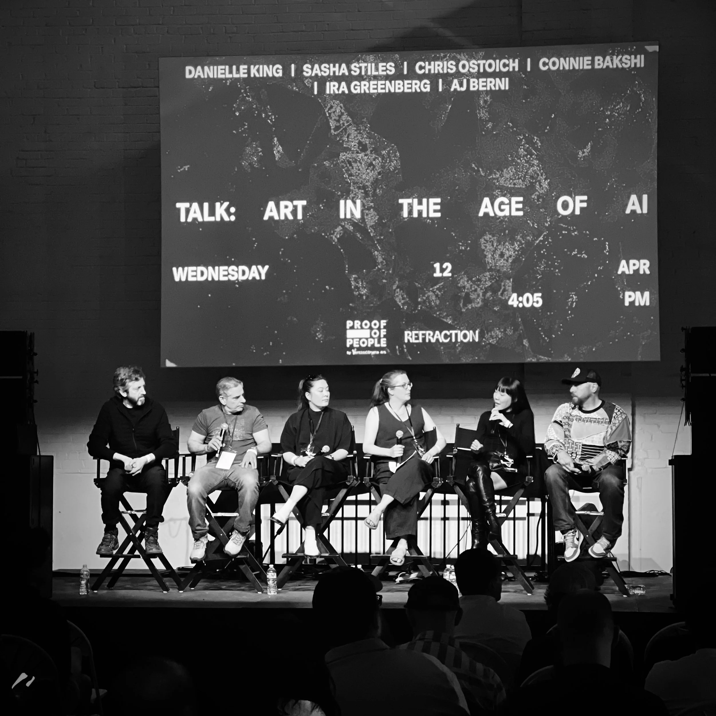 Proof of People x RefractionDAO at NFT.NYC | “Art in the Age of AI.” Panel with Sasha Stiles, Connie Bakshi, Adam Berninger, Ira Greenberg, and Chris Ostoich, moderated by Danielle King. 12 April 2023. New York, NY.